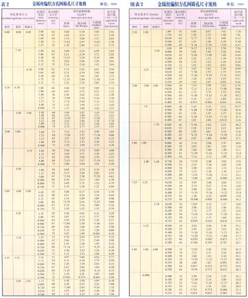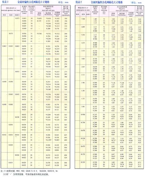 金属丝网编织网是按照航空标准HB1862-93和国家标准GB5330-85标准,并等效采用用国际标准ISO9044-90标准组织生产,其编织结构形式有平纹和斜纹两种,见图1、图2。工业网用金属丝按照Q/90183-2002标准拔制而成,丝材规格见详细参数表,其丝网材质选用优质黄铜、锡青铜、不锈钢、纯镍等。金属丝编织方孔网分为R10、R20、R40/3系列;筛孔尺寸6.00~0.025mm(3~500目/英寸),网孔规格见详细参数表2。