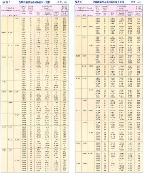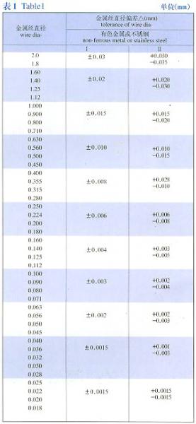 金属丝网编织网是按照航空标准HB1862-93和国家标准GB5330-85标准,并等效采用用国际标准ISO9044-90标准组织生产,其编织结构形式有平纹和斜纹两种,见图1、图2。工业网用金属丝按照Q/90183-2002标准拔制而成,丝材规格见详细参数表,其丝网材质选用优质黄铜、锡青铜、不锈钢、纯镍等。金属丝编织方孔网分为R10、R20、R40/3系列;筛孔尺寸6.00~0.025mm(3~500目/英寸),网孔规格见详细参数表2。